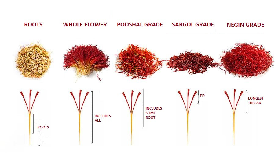 Here's a breakdown of different grades of saffron, from the highest quality to the parts closer to the flower's base: